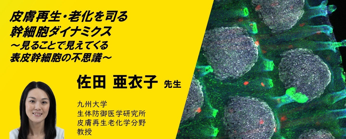 今回は「皮膚再生・老化を司る幹細胞ダイナミクス ~見ることで見えてくる表皮幹細胞の不思議~」というタイトルで、佐田 亜衣子 先生(九州大学 生体防御医学研究所 皮膚再生老化学分野 教授)にご登壇いただきます。