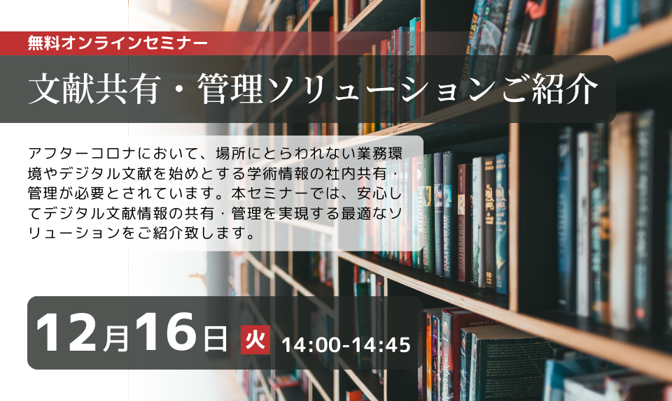 アフターコロナにおいて、場所にとらわれない業務環境やデジタル文献を始めとする学術情報の社内共有・管理が必要とされています。本セミナーでは、安心してデジタル文献情報の共有・管理を実現する最適なソリューションをご紹介します。