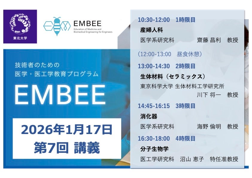 ◆2025年度 第7回 東京出張講義は 2026年 1月 17日(土)に開講致します。1月の開講科目は、産婦人科、生体材料(セラミックス)、消化器、分子生物学です。