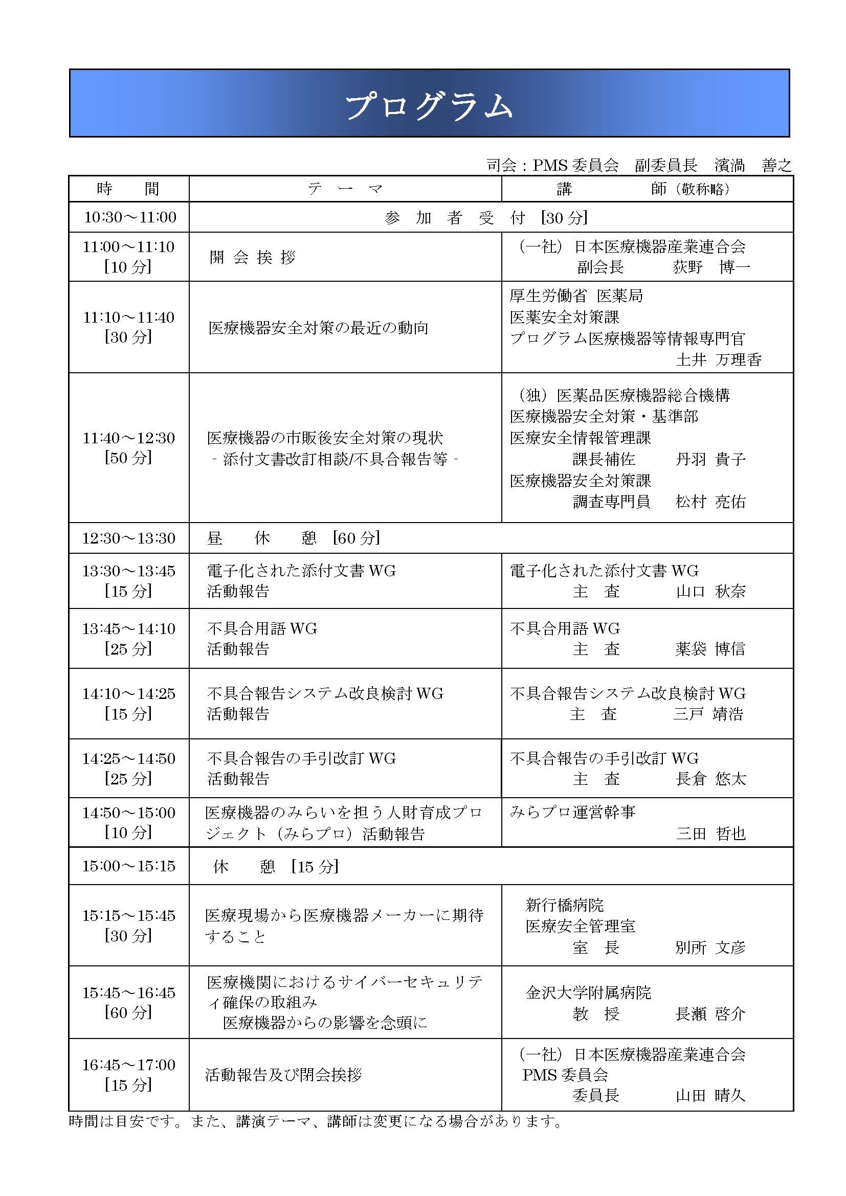 毎年、厚生労働省、PMDAからの最新情報のご講演の他、医機連内各WGの活動報告及び医療現場の先生方からのご講演をいただいており、医療機器メーカーにとって大変参考となる内容となっております。