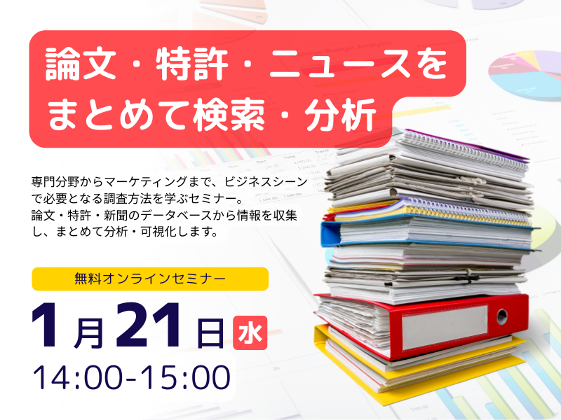 データベースサービスを活用した学術文献の調査をご体験いただけるセミナーです。調査の流れや検索した結果のグラフ化など、データベース活用方法を実習形式でご紹介します。
