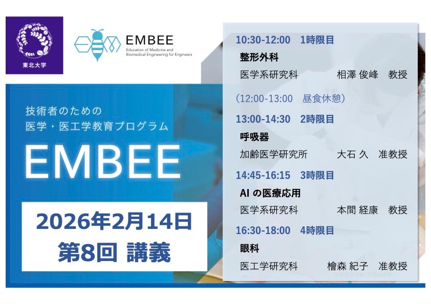 新たに医療機器産業に参入される企業の方など社会人技術者を主な対象として、臨床医学(診断・治療)の各領域とその理解に必要な基礎医学(解剖・生理)等を学ぶことに加えて、医療に革新をもたらす医工学の各分野の最新動向についても知ることができる教育コースです。毎月1回土曜日に東京で開催する出張講義(オンライン聴講も可能)と、9月に2日間仙台の東北大学にお越しいただき、実物を扱って体験する実習から構成され、主に医工学研究科・医学系研究科・工学研究科・病院の教授・准教授陣が講師を務めます。