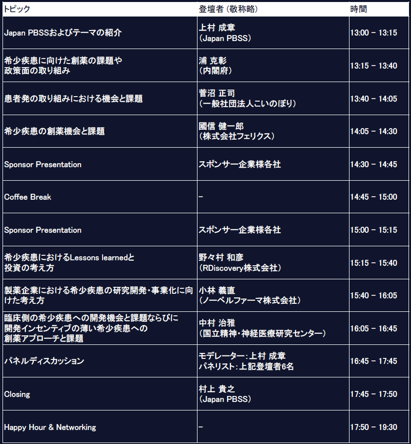 また、希少疾患の中でも開発が進まない顧みられない希少疾患への開発をどのように促すか、ということを考える機会にします。セッション後にはネットワーキング(ハッピーアワー)を設け、参加者同士の関係性構築や連携・協業のきっかけづくりを後押しします。