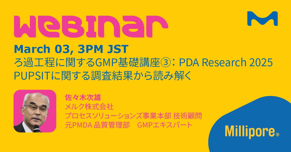 2022年8月のPIC/S GMP Annex1改定にともない、日本でもろ過滅菌工程へのPUPSIT導入検討が飛躍的に増加しています。2025年10月、PDAよりPUPSITに関するBenchmarking Survey(調査報告書)が発行され、新Annex1施工後のPUPSIT導入について新たな知見が示されました。本ウェビナーでは、メルクプロセスソリューションズの技術顧問である元PMDA佐々木次雄先生に、調査結果の解説と、過去の同様の調査結果との比較から読み解く現在の傾向などについてお話をいただきます。