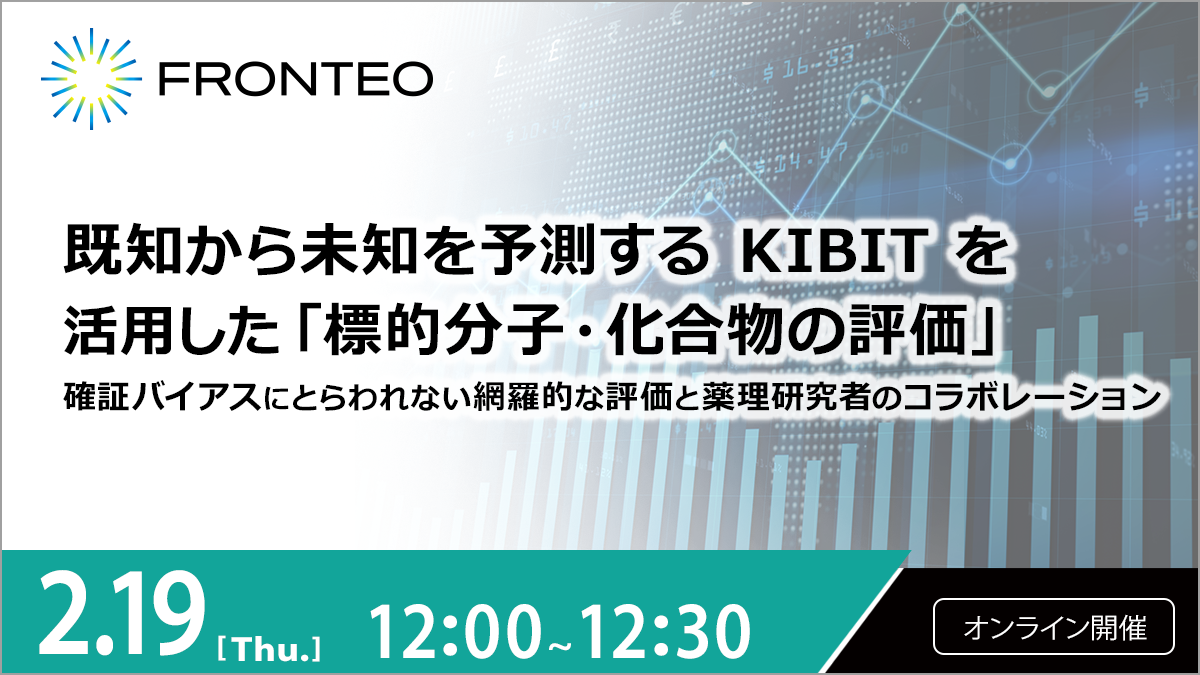 FRONTEOの独自開発した自然言語処理AI「KIBIT」は、事象を連続的に繋げて導く、従来型の発見とは異なり、文献に記載のない関連性であっても予測し見つけ出す、非連続的な発見を可能とするAIエンジンです。このKIBITをベースに、新規性の高い標的探索、創薬アセット(化合物など)の価値最大化を目的とした適応症探索などに対するソリューションとして「Drug Discovery AI Factory(DDAIF)」を展開しています。本セミナーではDDAIFの実際の応用例として、創薬候補となる「標的分子・化合物の評価」を行うケースについて紹介いたします。