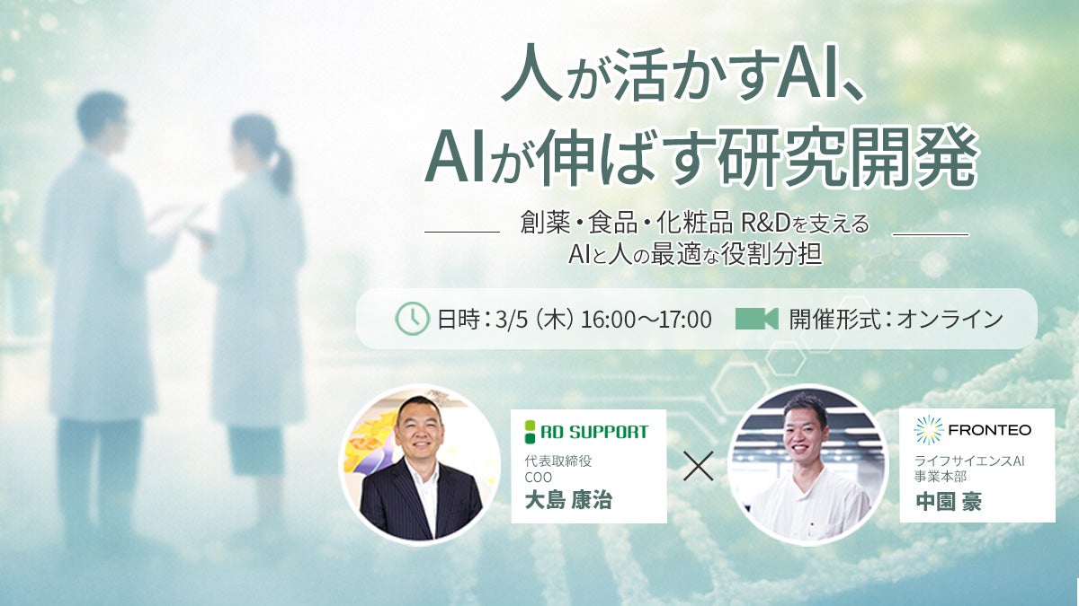 本セミナーでは、FRONTEOの研究支援サービス「Drug Discovery AI Factory」が生み出す、新規性の高い標的遺伝子の探索や適応症探索を通じて、AIと研究者が共創する新たなアプローチをご紹介。さらに、理系専門職の人材サービスを提供するRDサポートからは、AIが提案した示唆を正しく読み解き、研究戦略や実験設計に落とし込める「AIと共に働く研究者像」をご紹介。AI活用をスムーズに推進するために必要な人材のスキルセットをお伝えします。