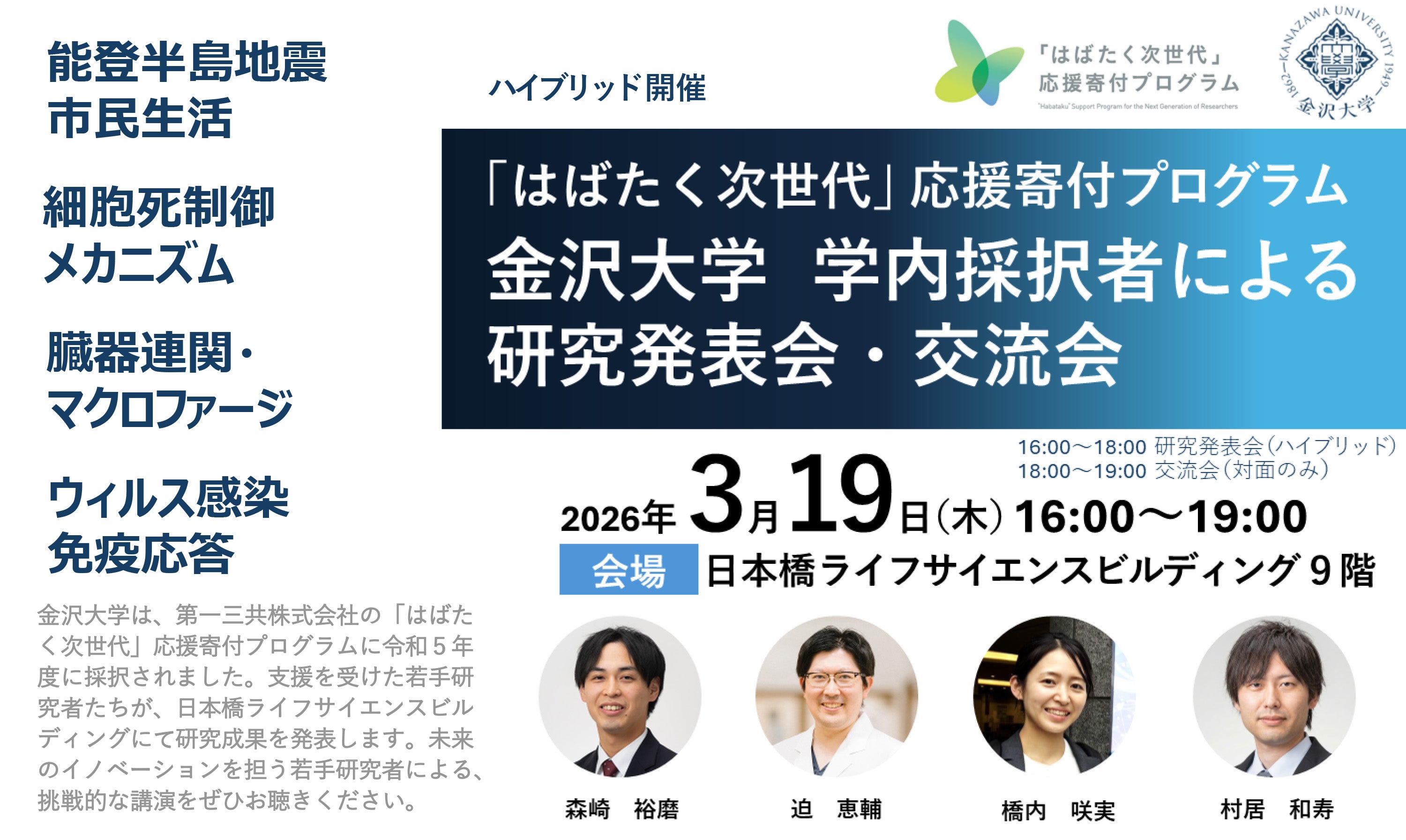 金沢大学は、第一三共株式会社の「はばたく次世代」応援寄付プログラムに令和5年度に採択されました。この支援を受けた若手研究者たちが、日本橋ライフサイエンスビルディングにて研究成果を発表します。未来のイノベーションを担う若手研究者による、挑戦的な講演をぜひお聴きください。