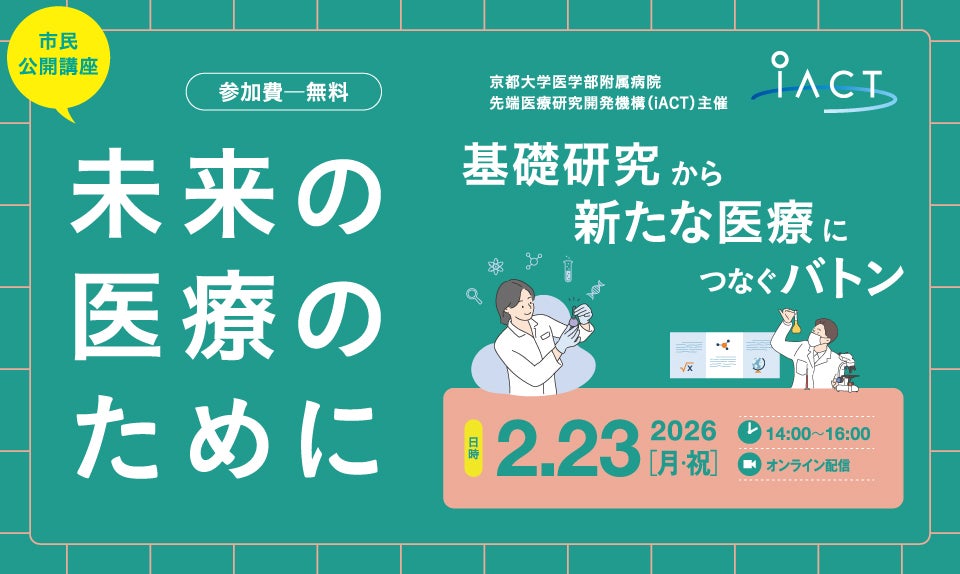 本講座では、一見医療とは遠い「基礎研究」と、それを臨床研究につないでいくための「橋渡し研究」にも焦点を当て、臨床研究・治験と共に新しい医療が実を結ぶまでのプロセスについて、京都大学に所属する3名の研究者から講演いただきます。最後に研究者3名を含めたパネルディスカッションを行い、それぞれ異なる分野の視点をもつ研究者の皆さんと一緒に、未来の医療について考えたいと思います。