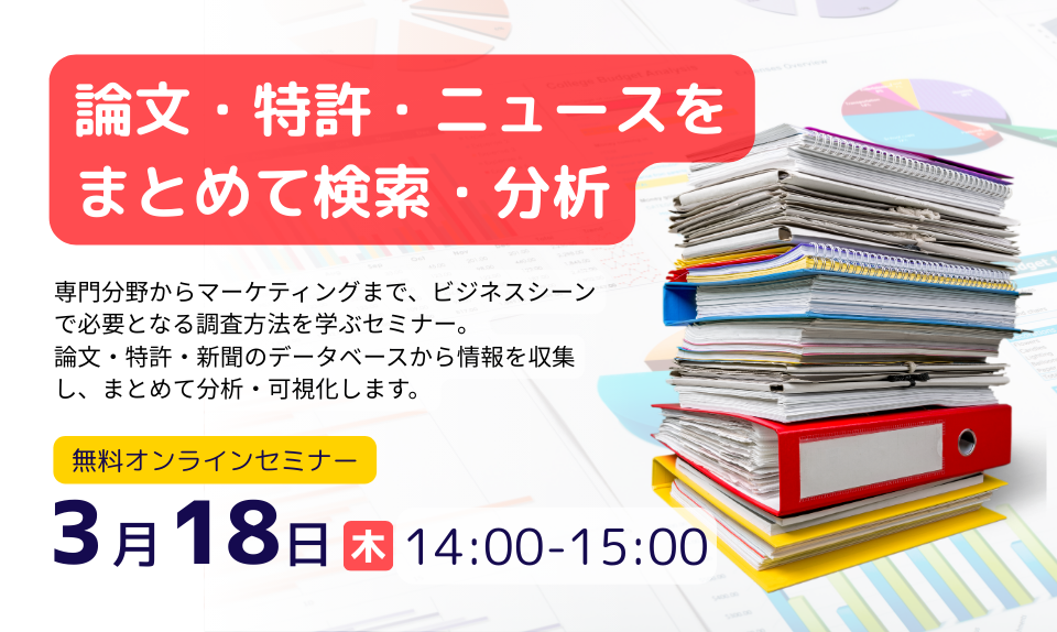 論文・特許・新聞のデータベースから情報を収集し、まとめて分析・可視化します。