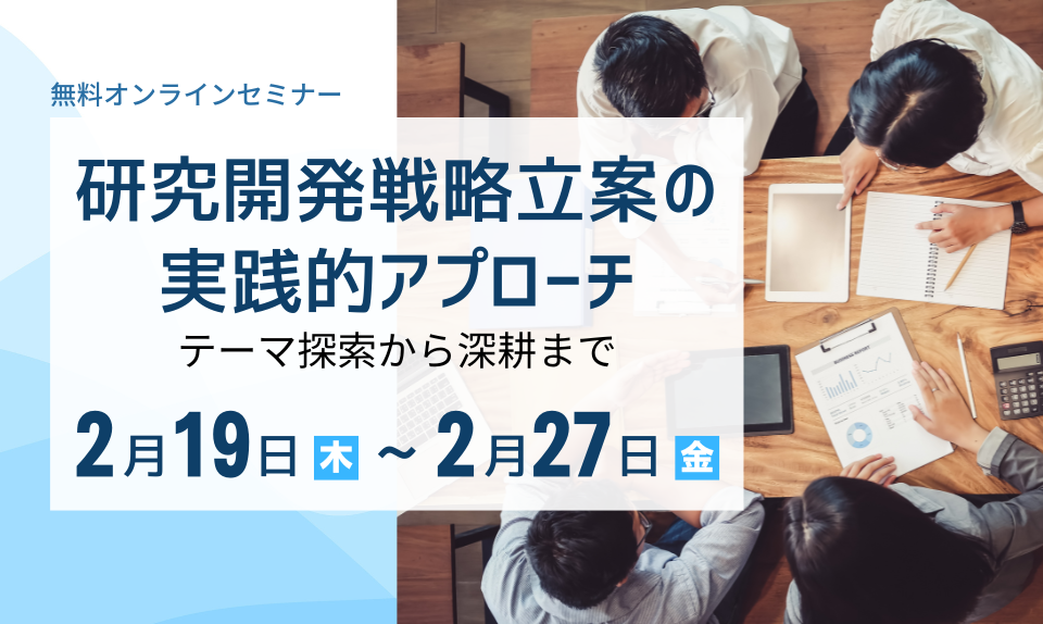 研究テーマの方向性を見つける初期の探索から、その後の深掘り調査まで、研究開発における情報収集を効率化したい方向けのセミナーです。