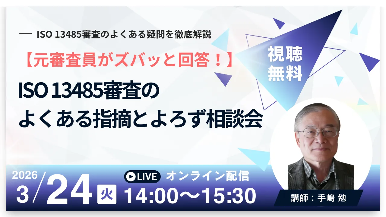 元ISO 13485主任審査員・医療機器コンサルタントの手嶋勉氏を講師に迎え、認証機関での19年間の審査経験をもとに、審査員の視点から見た「よくある指摘Top3」と実務に直結する改善アドバイスをわかりやすく解説します。また今回は「よろず相談会」として、事前に申込フォームで質問を募集し、講演の中でまとめてご回答いただきます。