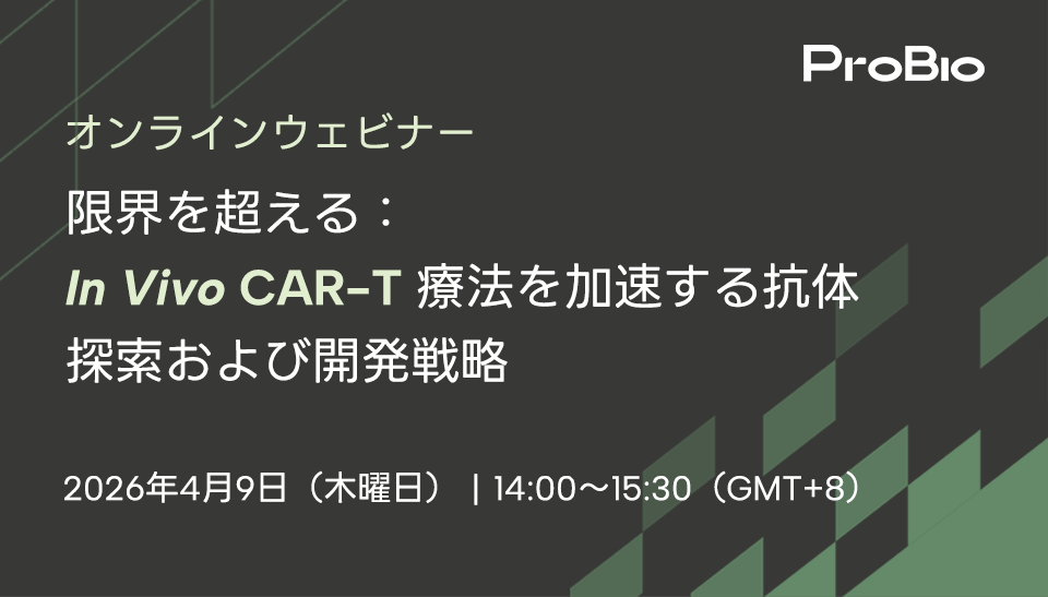 ProBio主催ウェビナーでは、in vivo CAR‑T応用に向けた抗体の探索および開発戦略について詳しくご紹介します。