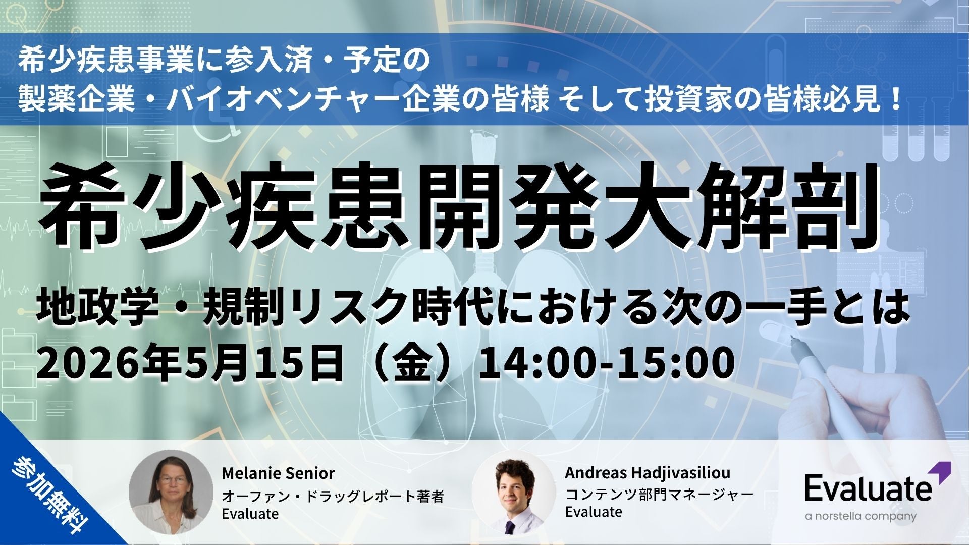 本ウェビナーでは、2032年までのエバリュエートのオーファンドラッグ売上予測レポートに基づき、ArgenxのVyvgartに代表される急成長フランチャイズから、治療領域の注力分野の変化まで、今後勝ち残る企業およびアセットについて専門家がディスカッション。