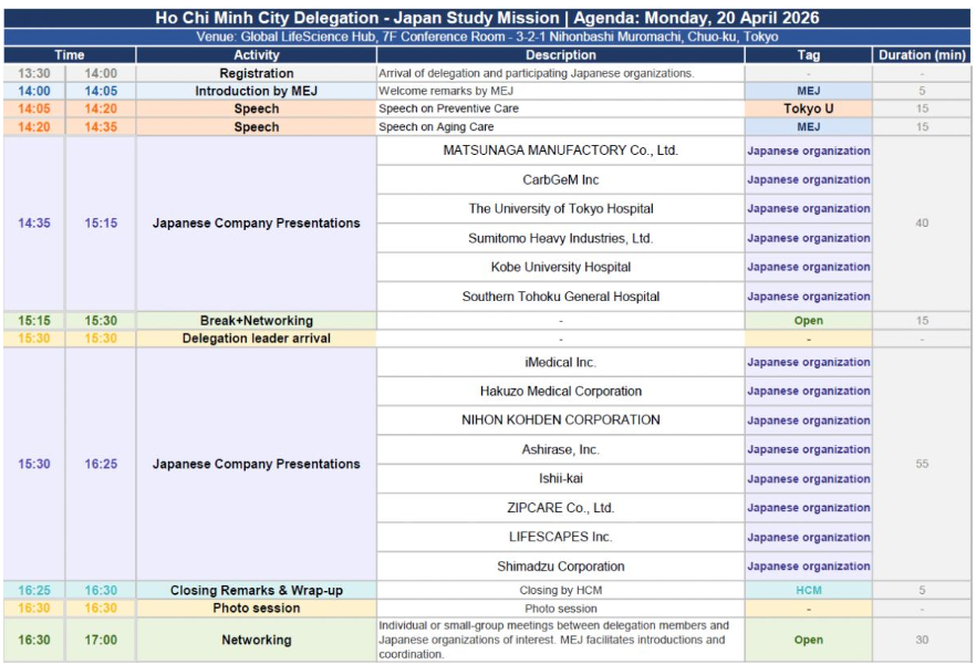 本視察団には、同市の医療行政を統括する保健局長をはじめ、軍病院175やタムアン総合病院などの有力病院の院長が多数参加されます。ベトナムの医療中枢を担うキーマンと直接交流できる貴重な機会であると存じます。