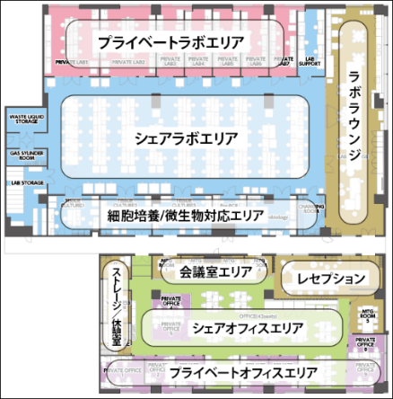 | 【ウェットラボ区画】 ベンチ:66席(予定)、個室ラボ、細胞培養室等 【オフィス区画】 オープンデスク、個室オフィス、ミーティングルーム等 【ラウンジ区画】 コミュニケーションラウンジ、共用キッチン、ウェルネスルーム等 レジデントカンパニーは、シーズ・アーリー段階のスタートアップ企業のニーズに合わせて用意された豊富な共通機器の利用が可能です |