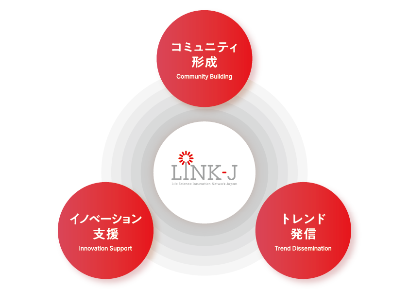 ビジョン 挑む人がつながり、知が循環し、資金がめぐる連鎖をつくり出し、世界が希望を抱くイノベーションが絶えず生まれるための進化を。LINK-Jは、エコシステムに次の“うねり”をつくりだす触媒として、オープンイノベーションを加速し続け、ライフサイエンスの未来を、日本から世界へと社会実装していきます。 | ![]() |